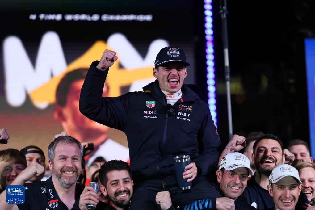 这是2024年11月24日★★,红牛车队荷兰车手维斯塔潘(上)在2024赛季F1拉斯维加斯大奖赛正赛结束后庆祝自己第四个F1世界冠军j9九游国际真人★★。新华社发(宋海源摄)