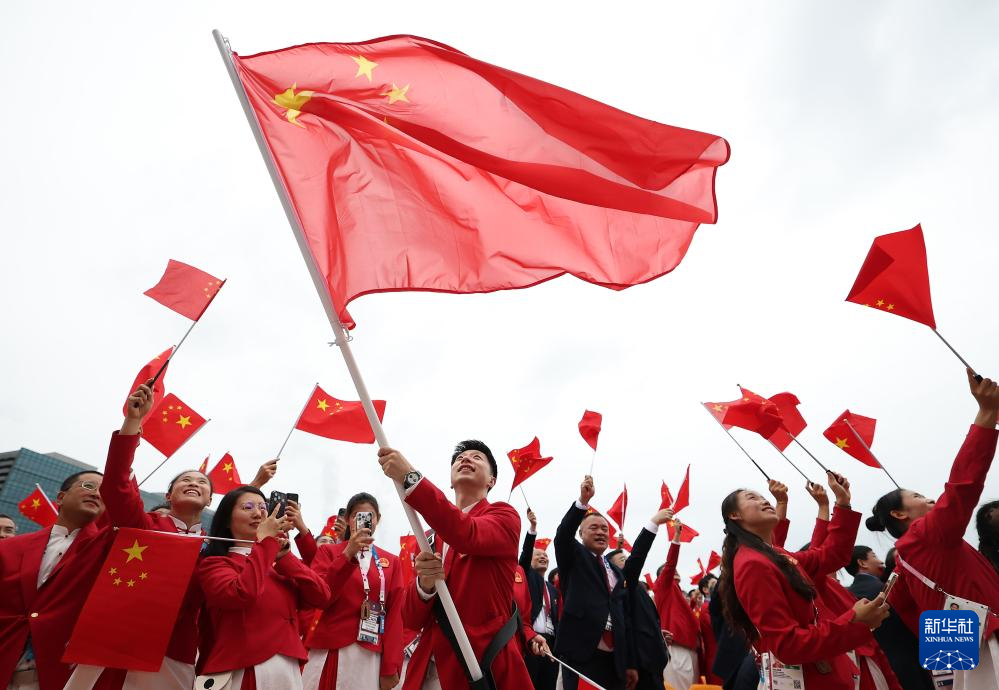这是2024年7月26日★★,中国体育代表团旗手j9九游国际真人★★、乒乓球选手马龙在巴黎奥运会开幕式前挥舞国旗★★。新华社记者 曹灿 摄